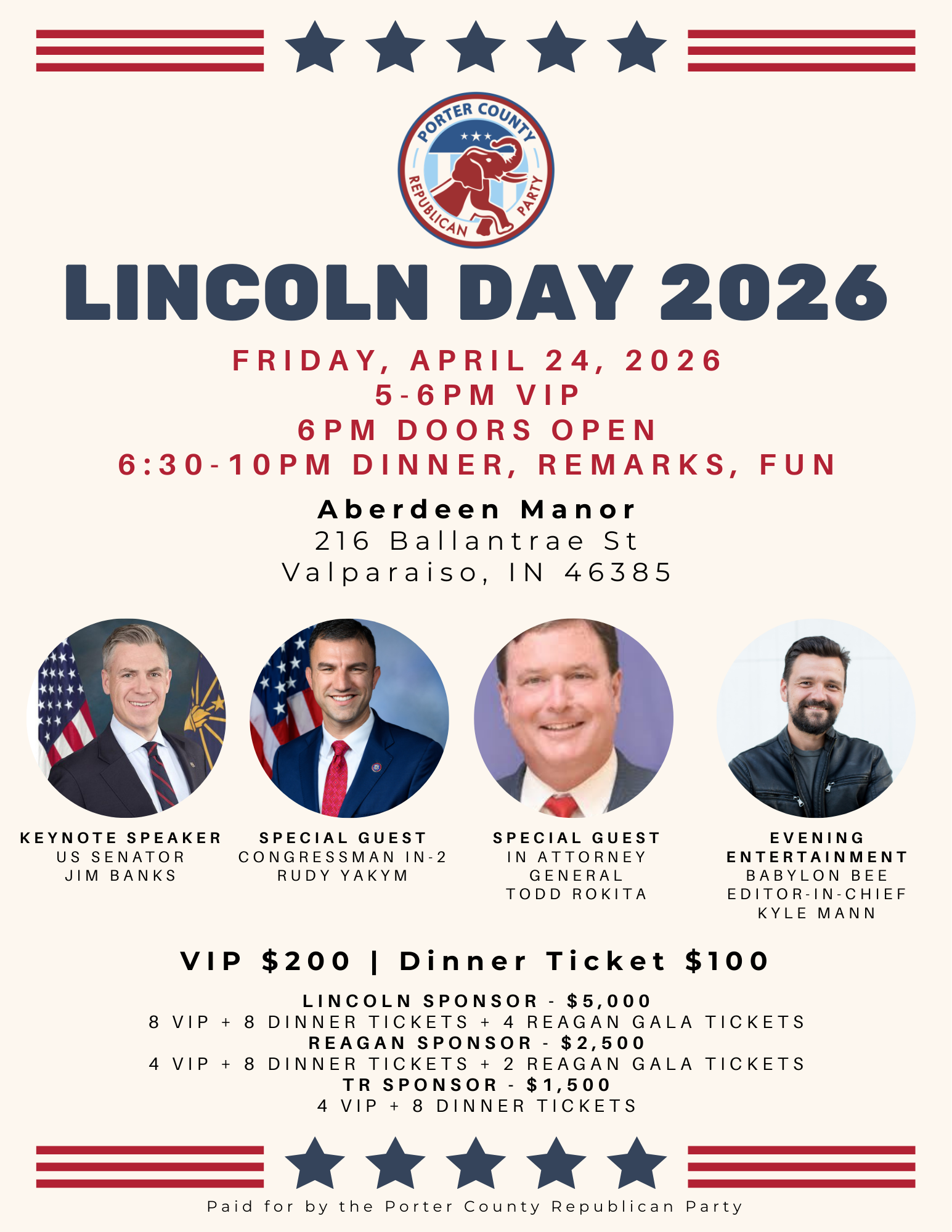 Doors open at 6 PM and dinner and program will follow from 6:30–10:00 PM, featuring remarks from our distinguished guests, party updates, and a celebration of the grassroots volunteers and supporters who power the conservative movement in Porter County and Northwest Indiana.